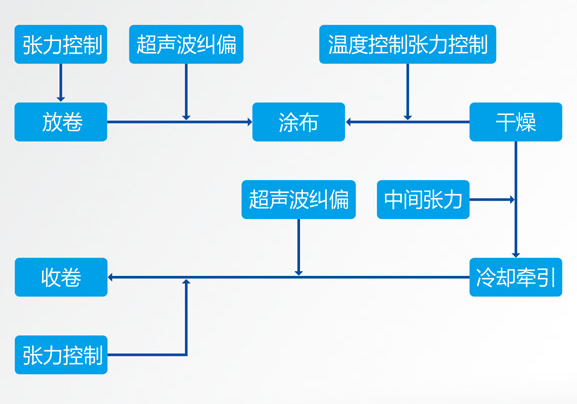 本機是高速涂布生產線,具有自動化程度高,生產效率高,產品精度高等優點,傳動控制采用微電腦中央控制,人機界面觸摸屏操作。
